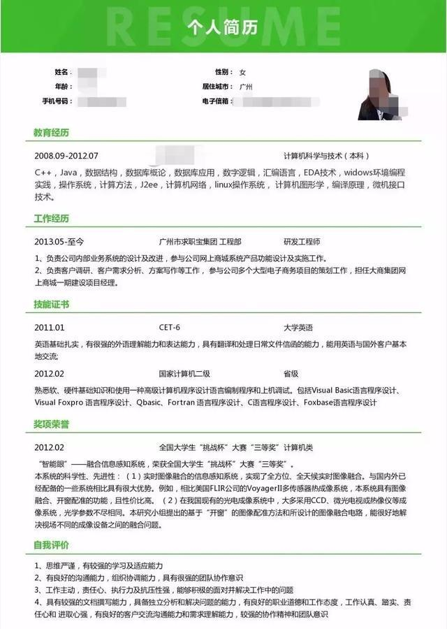上面的那个简历,可以作为模板,虽然不算一份最优秀的简历,但是一定是个合格的简历,看了这个简历,我是个HR,说实话都忍不住撩一下。