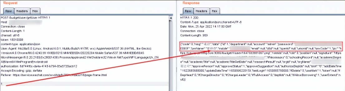 到这里后继续抓包,又发现一个有意思的包,赶紧尝试越权测试,修改body中的数字,看依一下响应,果然可以越权,哈哈哈,一般管理员的id不是0就是1 ,改成1试一下看能不能越权到管理员,我去,1就是管理员