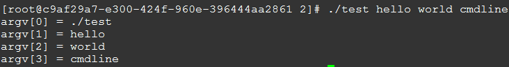注意程序本身的名字为命令行的第一个参数。编译这段代码生成test程序,然后在命令行下执行,尝试传入命令行参数,如:./test hello world cmdline,可以看到程序打印出了具体的命令行参数信息: