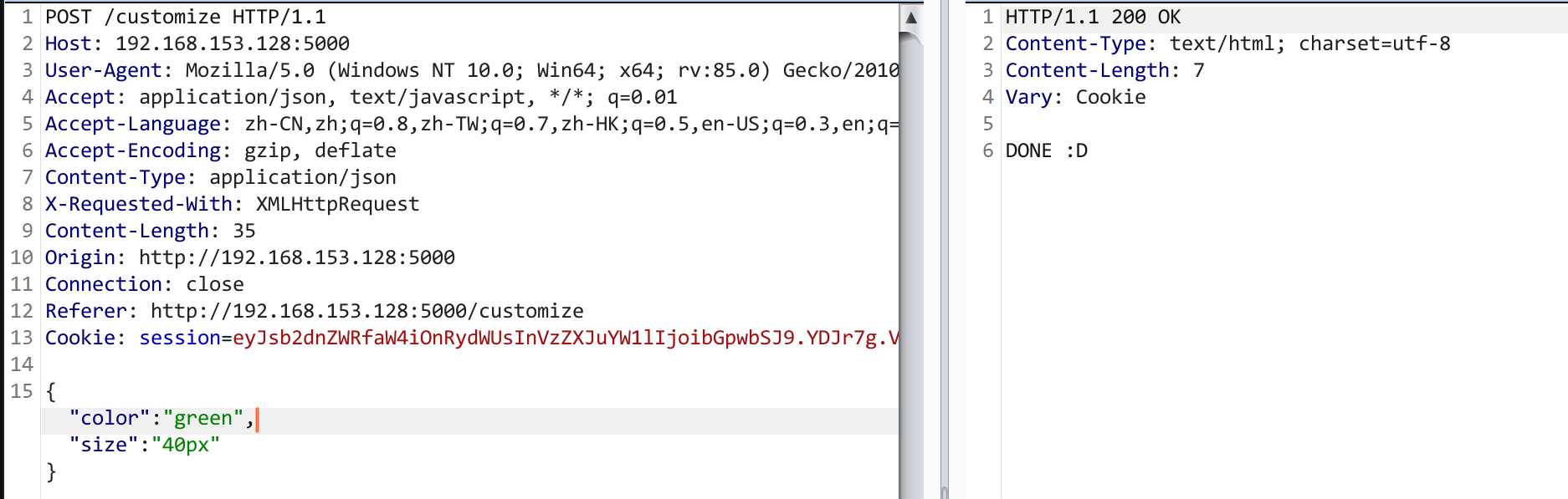 至于上面的51px;为什么不是50px;我也不知道QAQ。这个环境就只有两个功能,上面那个发帖子的功能和这个修改样式的功能,发帖子功能大概没什么bug,唯有这个修改样式的比较可疑。我们可以通过burpsuite抓包分析一下。