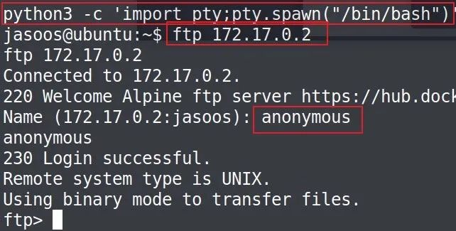但是这个shell有点难用,我们可以调用python实现一个友好一点的shell,然后用匿名账号登录到ftp