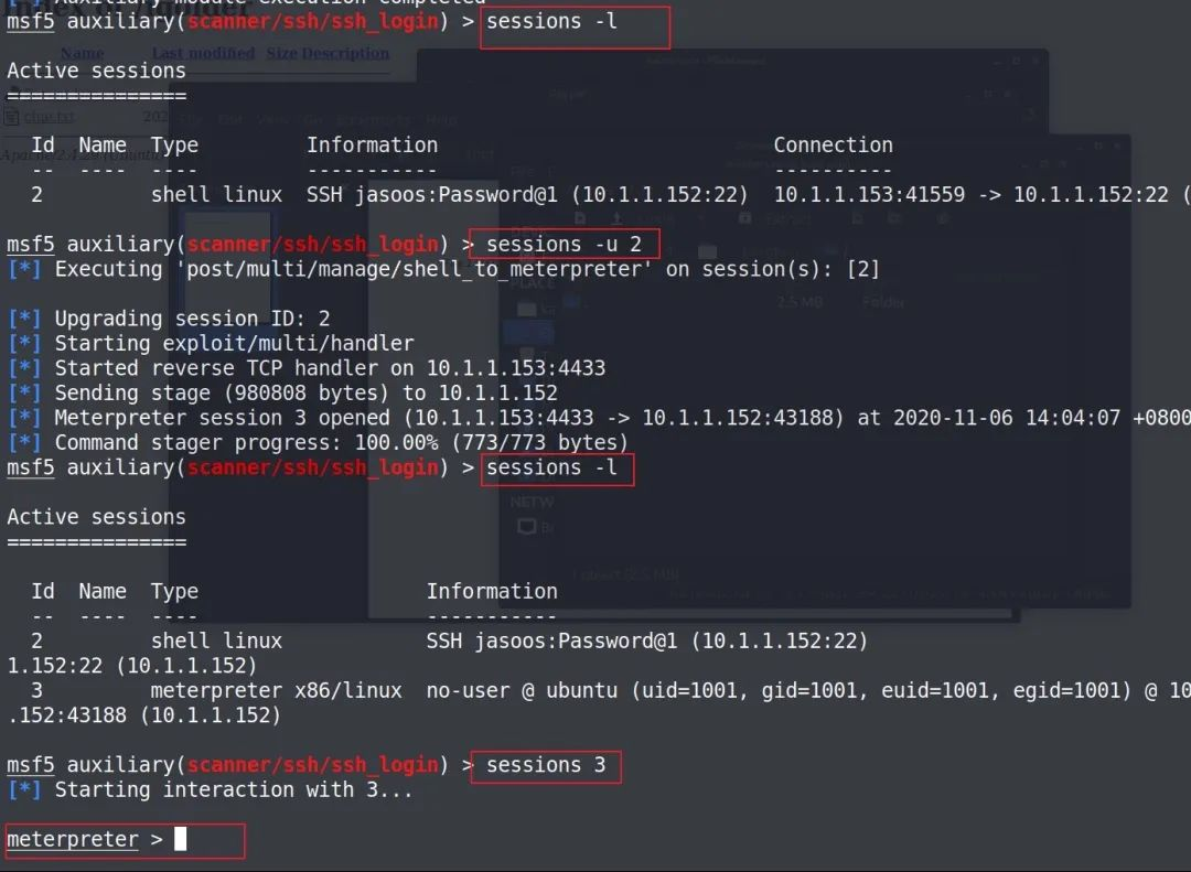可以看到登录成功了。我们可以用session -u 升级成一个meterpreter会话