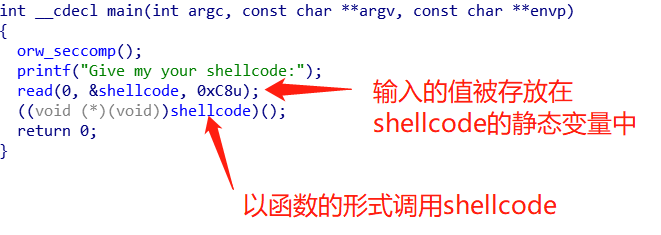 名为shellcode的变量位于.bss段,在输入完毕后会将该变量以函数的形式调用,则这道题不需要去寻找shellcode的返回地址,直接输入一段shellcode即可