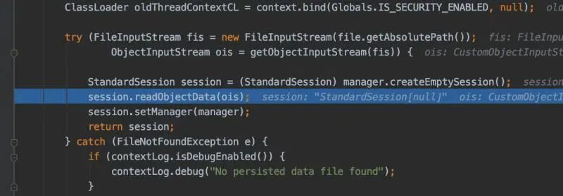 当使用tomcat时,如果使用了tomcat提供的session持久化功能,就会在一次会话中尝试读取session文件中的内容,并进行反序列化。