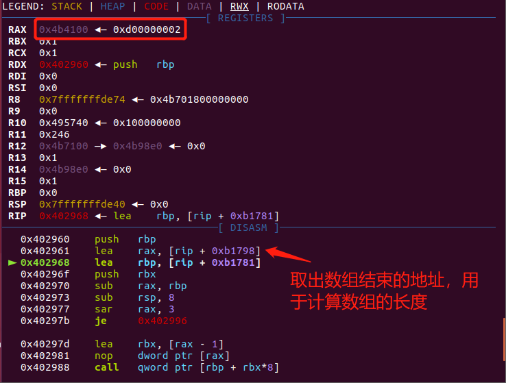 .text:0000000000402970 sub rax, rbp #获得数组的长度