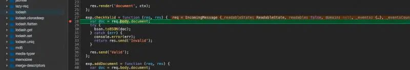 由代码溯源分析得到,toBSON的参数string是req.body中的document,因此这一部分我们可控。可以发现vm.runInNewContext函数,这是一个虚拟沙箱。因此们下一节分析怎么绕过沙箱防护。
