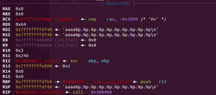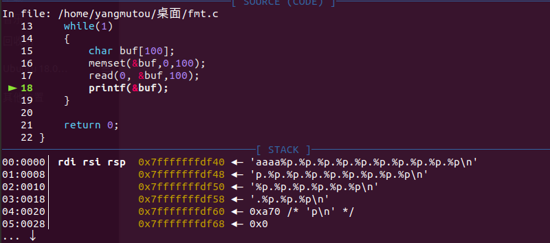 我们可以控制 printf 的参数。我们输入 “aaaa%p.%p.%p.%p.%p.%p.%p.%p.%p.%p”到 0xffffd11c 栈地址处