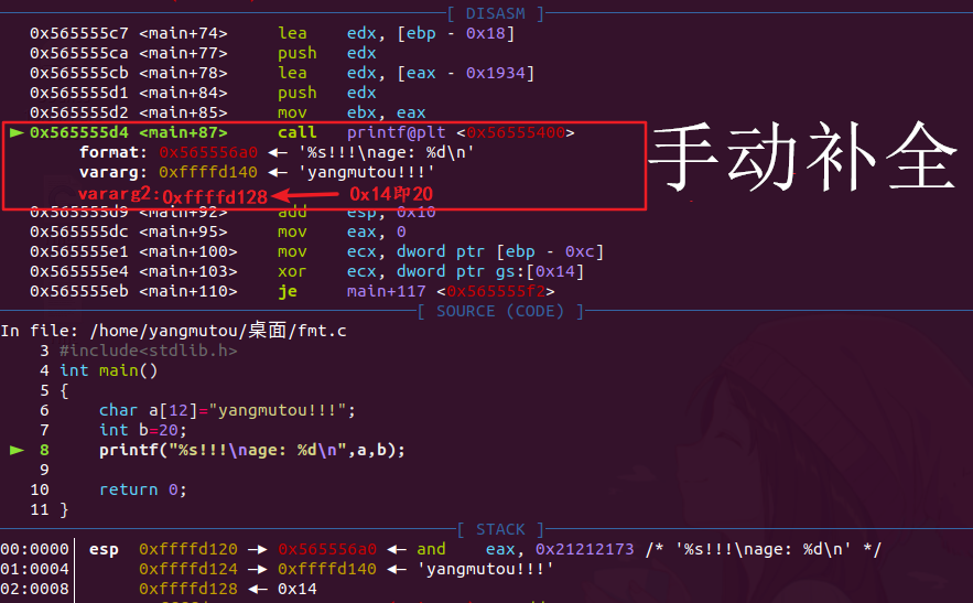 我们可以观察下 栈地址 0xffffd11c+0x4*2 处中的地址是个 指向字符串的指针