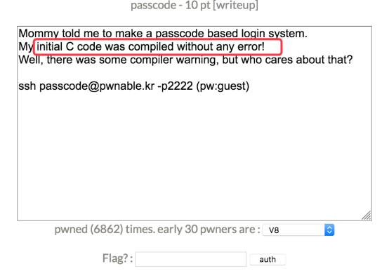 3,login()中scanf接收输入的时候,passcode1,passcode2没有加上&取地址,又由于passcode1,passcode2没有被初始化,所以我们scanf输入数据时,数据被保存到哪儿是未知的,只是知道数据被保存到passcode1,passcode2的值指向的地址中去了。