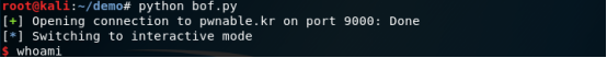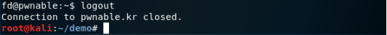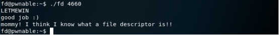 Atoi接收的参数我们可以控制,只要令argv[1]为0x1234(argv[0]为程序名称,argv[1]为输入参数),0x1234十进制为4660,经过运算最后赋值给fd的就是0,然后再传入read(),由于fd为0,所以我们在命令行中输入什么,则在buffer中写入的就是什么,只要输入LETMEWIN就可以了