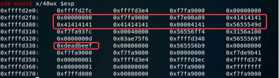 可以看到0xdeadbeef在0xffffd330,而我们输入的A是从0xffffd2fc开始