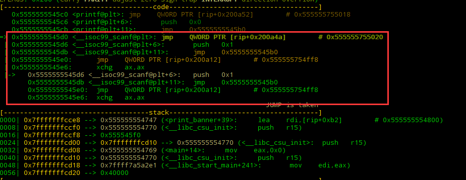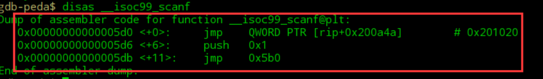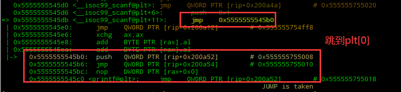 看函数的名字就可以知道这是scanf函数的plt表,先不着急去了解plt是做什么用的,我们继续往下看我们先看一下第一个jmp是什么跳到哪里。