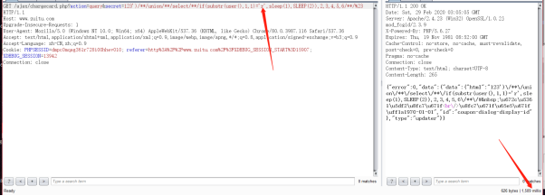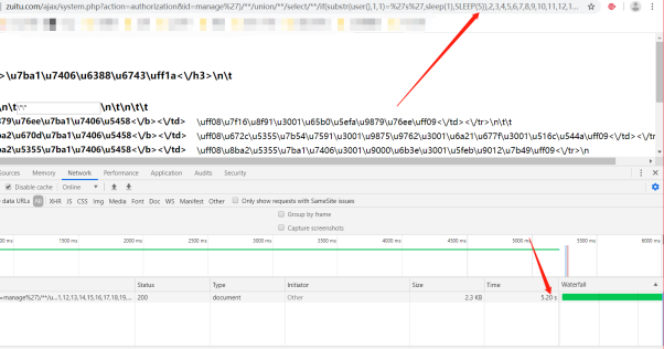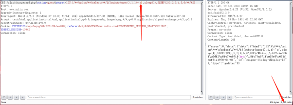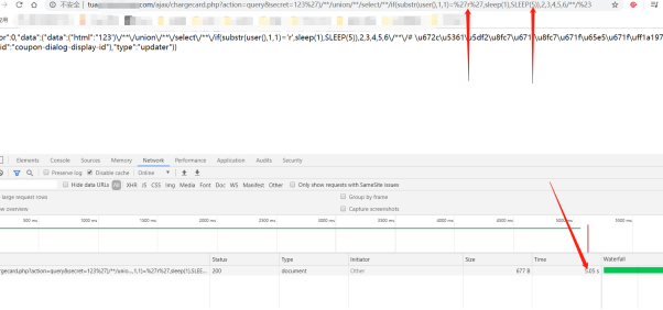 因为此处不存在回显,要使用盲注,使用时间盲注验证,一个用时2秒,一个用时5秒