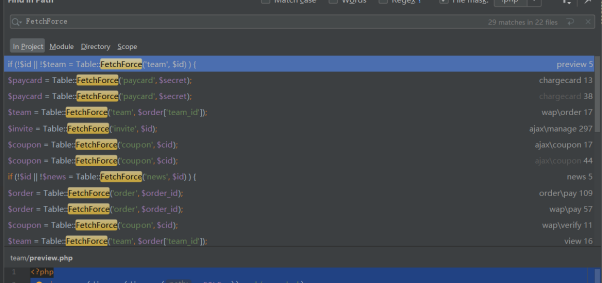 此处采用敏感函数回溯的方法进行审计,先全局搜索这些函数,然后想办法对达到触发条件。