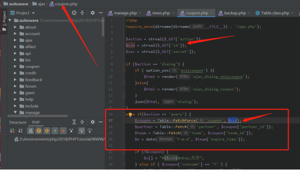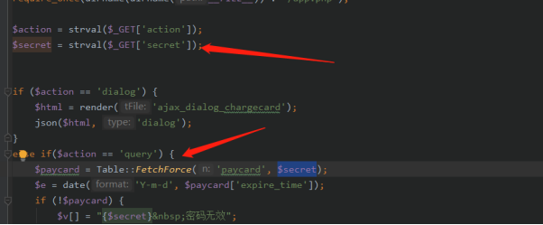 不需要登录便可以直接访问这个文件,当$action为query时可以调用函数,且$secret不存在过滤,开启debug调试跟踪参数的流程:先输入secret=123’