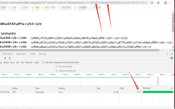 将存在恶意字符的参数拼接SQL语句,造成SQL注入,因为此处存在对空格等字符的正则匹配,所以可以使用/**/代替空格。