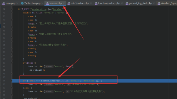 但是在之后对从本地文件恢复数据库的功能进行审计发现,此处存在任意SQL语句执行,相当于给我们提供了一个执行任意SQL语句的接口,那么便可以尝试通过SQL命令导出文件getshell和MySQL日志getshell。先来看一下程序逻辑: 在数据库恢复功能提供了从本地文件恢复的功能: