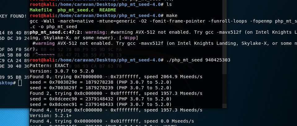 我们利用php_mt_seed工具(C编写,速度很快)可以根据随机数碰撞出随机数的种子,从而获取flag:
