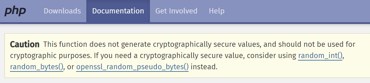 可以看到PHP Manual其实提示了生成随机数用于加密是不安全的,但是这个Caution不知为何只存在于英文版的PHP Manual中,中文版被遗漏了…这可能也是很多国内的开发应用出现过此缺陷的一个原因。