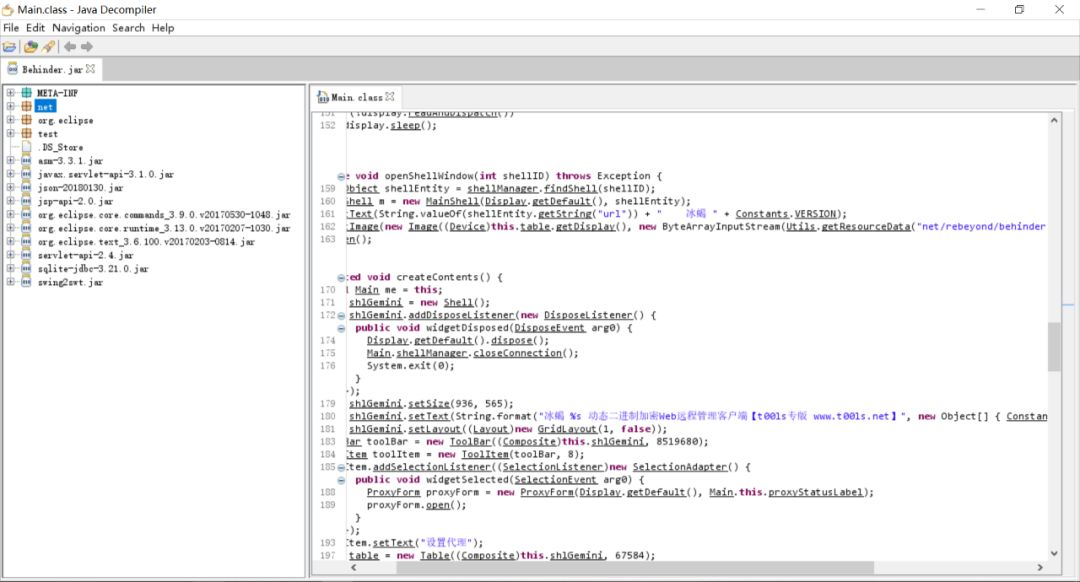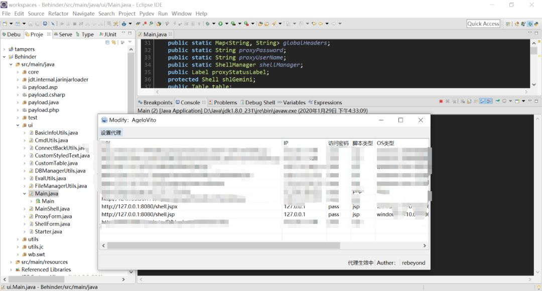 对于具体如何反编译Behinder.jar到在eclipse中运行起来Behinder的详细过程本文不累述,因为这是耗时的体力活,我们要解决很多问题,很多没有java基础的童鞋也看不懂。这里只讲大概思路,首先我们可以通过Import Jar As Project插件将Behinder.jar导入eclipse,这样在ecplise中就创建了一个存在一堆报错的Behinder项目,然后再利用上文提到的三款反编译软件对Behinder.jar进行反编译,将每个文件以及每个java类中的方法进行对比,修改eclipse项目中的对应代码,在运用eclipse的相关报错信息进行有关反编译代码的排错,修改。这里解释一下为什么要用三款反编译软件,因为各自的优缺点不一样,反编译出来的代码也是不一样的,所以得综合尝试。