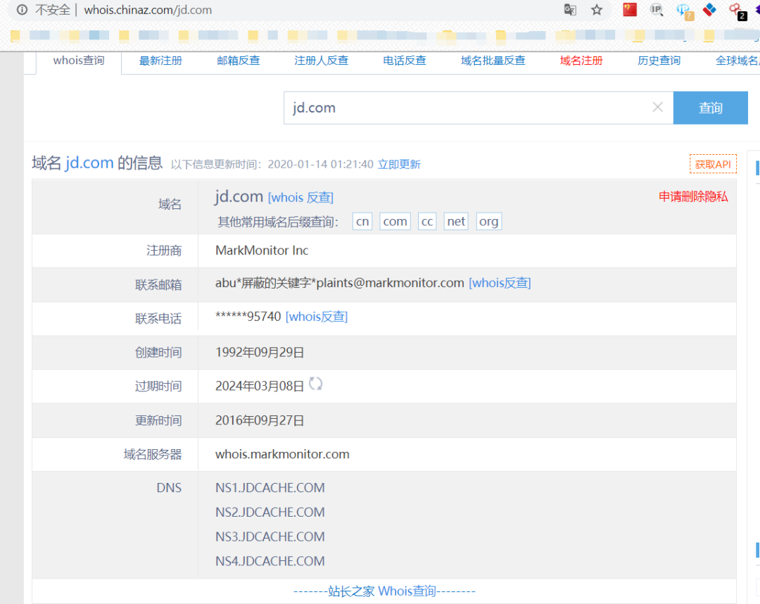 知道目标域名之后,我们要做的第一件事情就是获取域名的注册信息,包括该域名的DNS服务器信息和注册人的联系信息等。