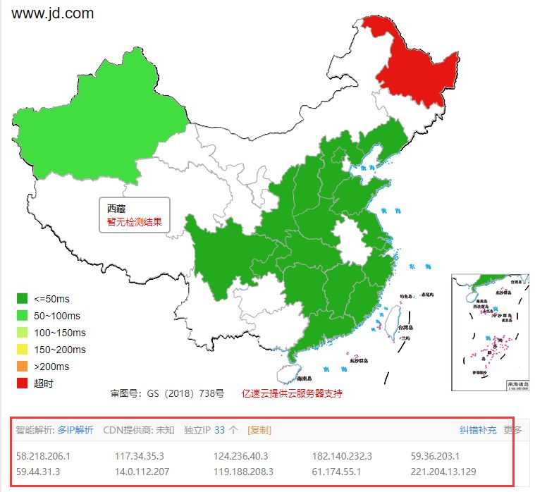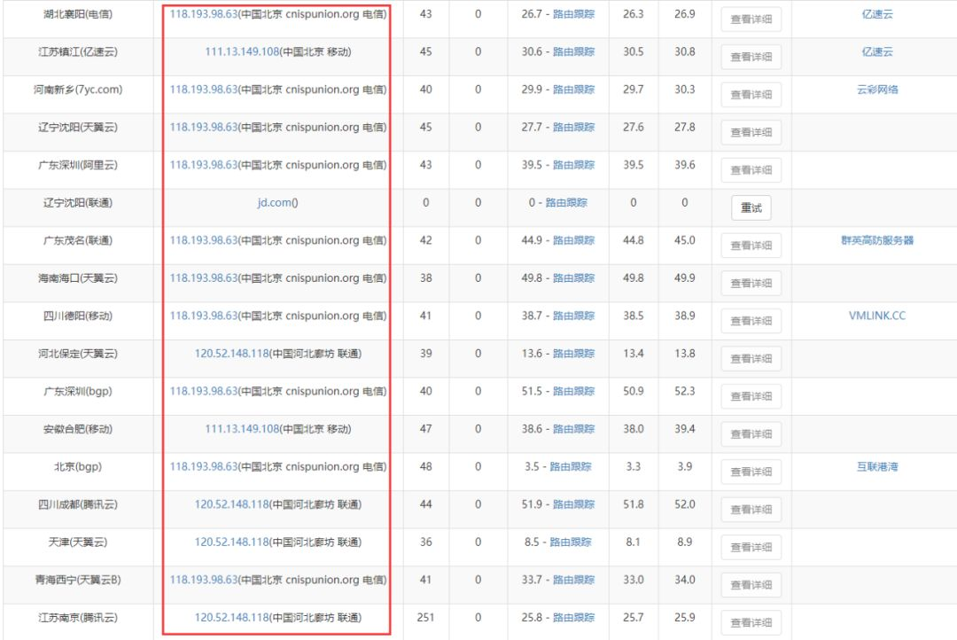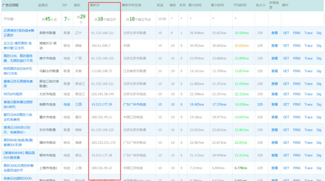 利用全国多地区的ping服务器操作,然后对比每个地区ping出的IP结果,查看这些IP是否一致, 如果都是一样的,极有可能不存在CDN。如果IP大多不太一样或者规律性很强,可以尝试查询这些IP的归属地,判断是否存在CDN。