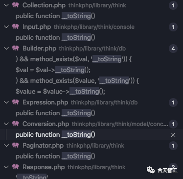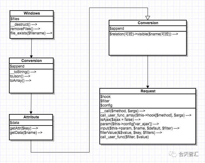 __destruct()方法调用到file_exists触发某类的__toString()来到toArray()函数通过控制分别位于 Attribute 和 Conversion 的