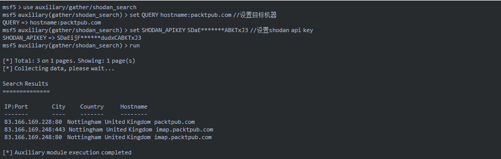 通过Shodan搜索模块可以找到更多目标的信息,比如 IP 地址,开放的端口,位置信息等。