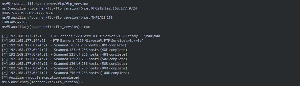 1、使用auxiliary/scanner/ftp/ftp_version模块,设置好扫描范围和线程,就可以运行扫描了。