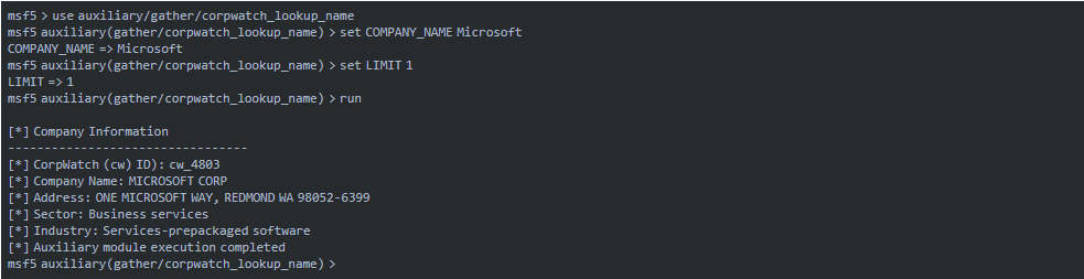 收集公司信息也是必不可少的,我们可以使用 CorpWatch公司名称信息搜索模块:auxiliary/gather/corpwatch_lookup_name,通过该模块可以收集公司的名称,地址,部门和行业信息。该模块与CorpWatch API连接,以获取给定公司名称的公开可用信息。