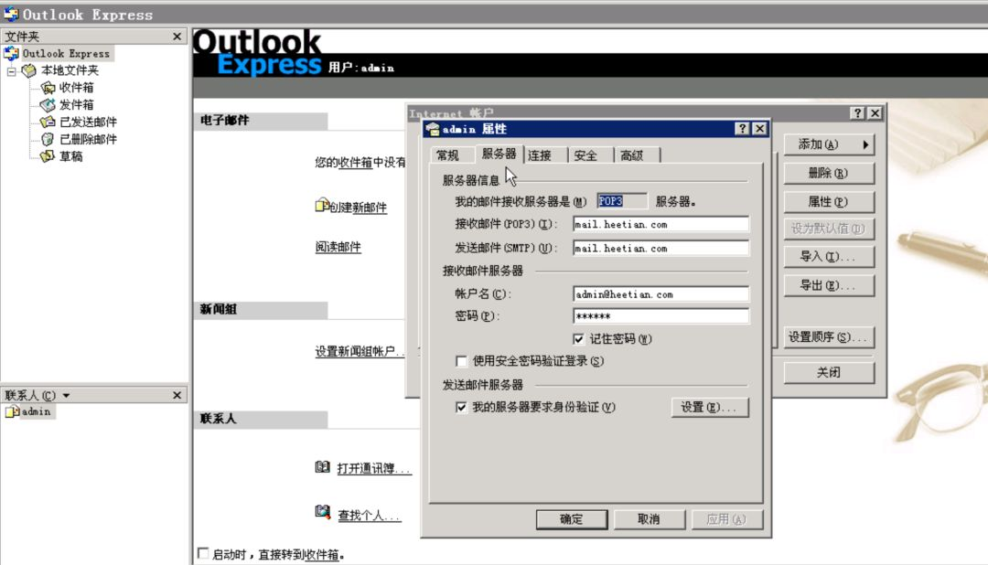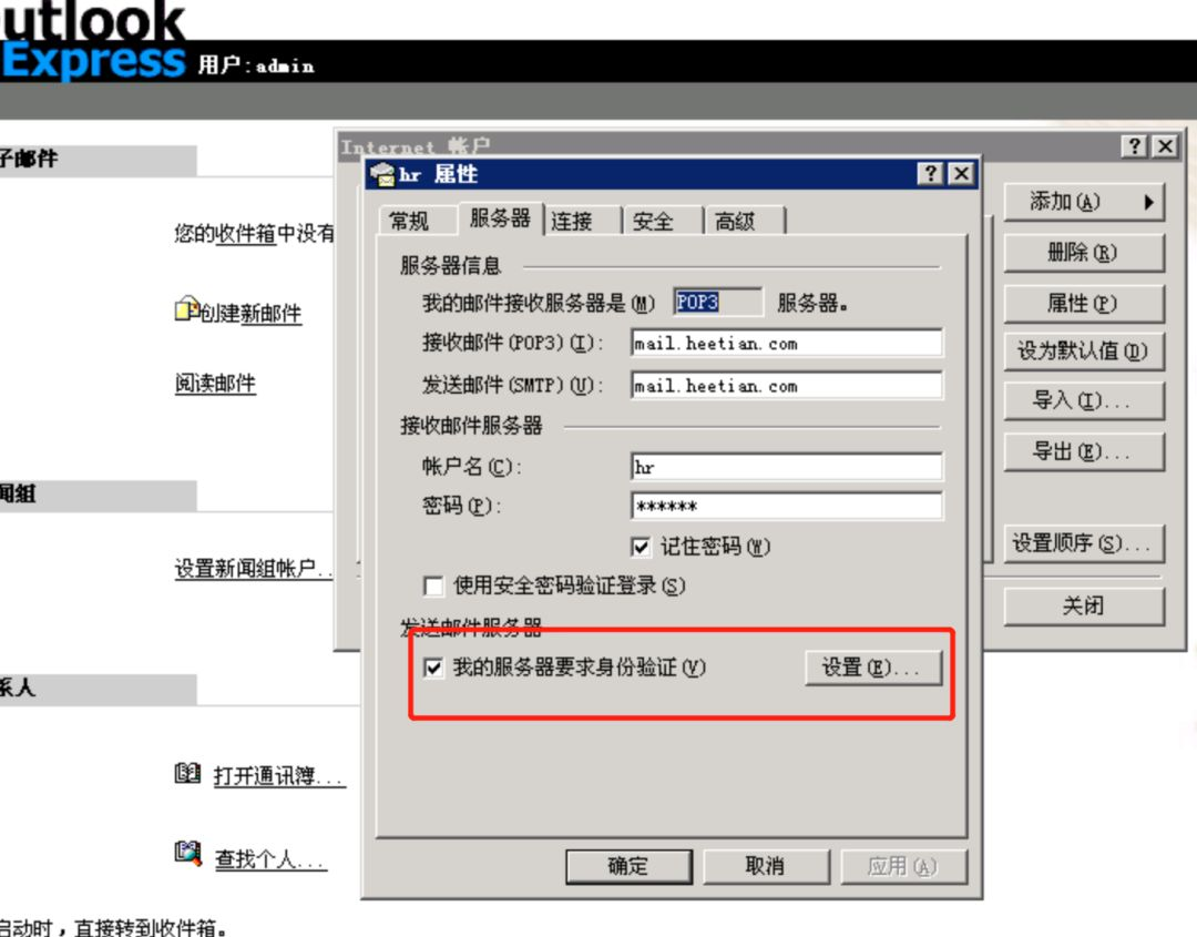 登录10.1.1.188服务器后,hmailserver已经安装好,管理口令为888888,并且配置了两个帐号,hr@heetian.com和admin@heetian.com。hr@heetian.com的帐号里已经默认收到一份钓鱼邮件。