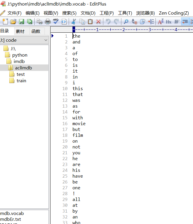 打开pos地下的文件,有很多,如下图所示,里面有很多语句 如下语句是0_9.txt Bromwell High is a cartoon comedy. It ran at the same time as some other programs about school life, such as “Teachers”. My 35 years in the teaching profession lead me to believe that Bromwell High’s satire is much closer to reality than is “Teachers”. The scramble to survive financially, the insightful students who can see right through their pathetic teachers’ pomp, the pettiness of the whole situation, all remind me of the schools I knew and their students. When I saw the episode in which a student repeatedly tried to burn down the school, I immediately recalled … at … High. A classic line: INSPECTOR: I’m here to sack one of your teachers. STUDENT: Welcome to Bromwell High. I expect that many adults of my age think that Bromwell High is far fetched. What a pity that it isn’t! 这个是正向的语句,代表1 ,而neg文件夹里面的词语代表0,还有一个文件叫imdb.vocab,这个文件集合了所有的词语,如下图所示: