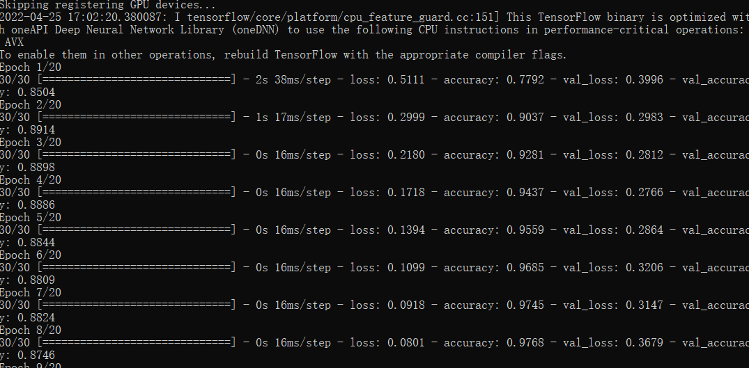 以下是训练过程 以下是训练过程的Epochs图: 一个完整的数据集通过了神经网络一次并且返回了一次,这个过程称为一次 Epoch,正向传播和反向传播都经历了,所有数据集识别和提取一次并反馈一次。