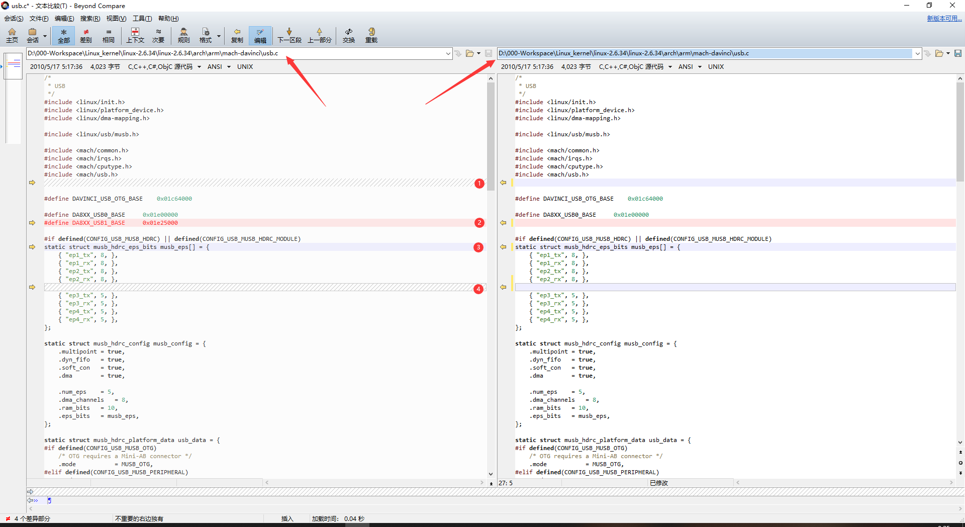 1.对于差别,可以直接点击左侧或者右侧的黄色箭头,代表的意思是把源文件覆盖到另一个文件。