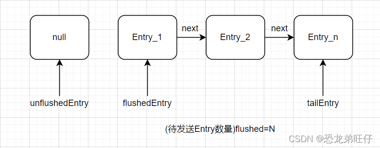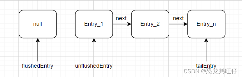 添加N个Entry对象后,第一个添加的Entry_1则作为unflushedEntry,其next指向Entry_2,最终添加Entry_n,则Entry_n为tailEntry。