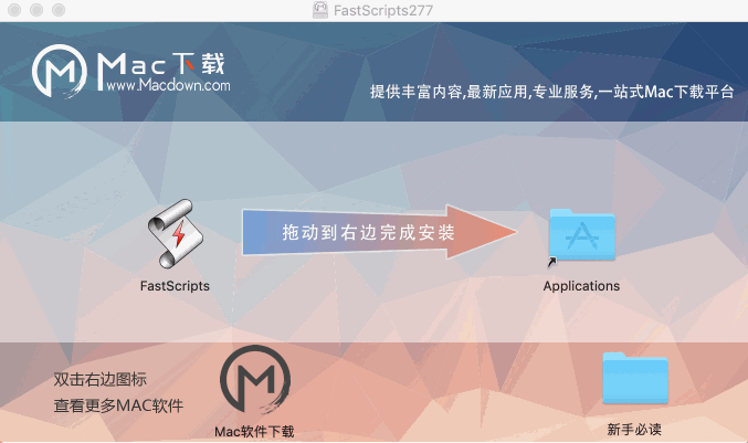 1.首先请下载名为【FastScripts277.dmg】的镜像包,下载完成后双击,看到许可协议,点同意即可开始安装。 2.将左侧【FastScripts】拖拽至右侧【Applicatios】应用程序中进行安装,等待静默安装完毕,在【访达】–应用程序中,点击软件图标,即可使用。
