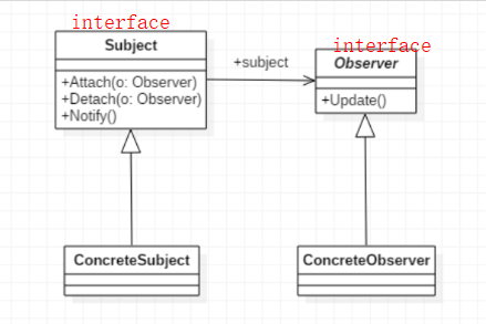大家要逐渐的接受这种面向接口编程的思想。面向接口编程,更容易扩展。简单的解释一下上边的UML图,首先要知道两个概念,一个是主题(topic),一个是订阅者。这两个在设计模式里边代表的是不同的类。主题类的接口一般会有这么几个方法:添加订阅者的方法,移除订阅者的方法,以及当状态改变时,通知订阅者做出对应的动作。