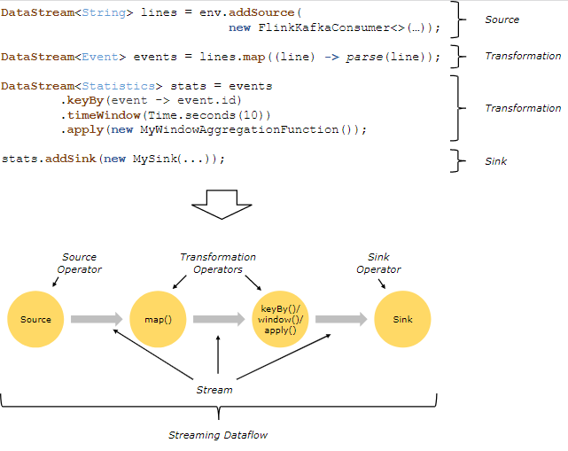 在 Flink 中,应用程序由用户自定义算子(operators)转换而来的流式 dataflows(streaming dataflows) 所组成。这些流式 dataflows 形成了有向图,以一个或多个**源(source)开始,并以一个或多个汇(sink)**结束。 通常,程序代码中的 transformation 和 dataflow 中的算子(operator)之间是一一对应的。但有时也会出现一个 transformation 包含多个算子的情况,如上图所示。