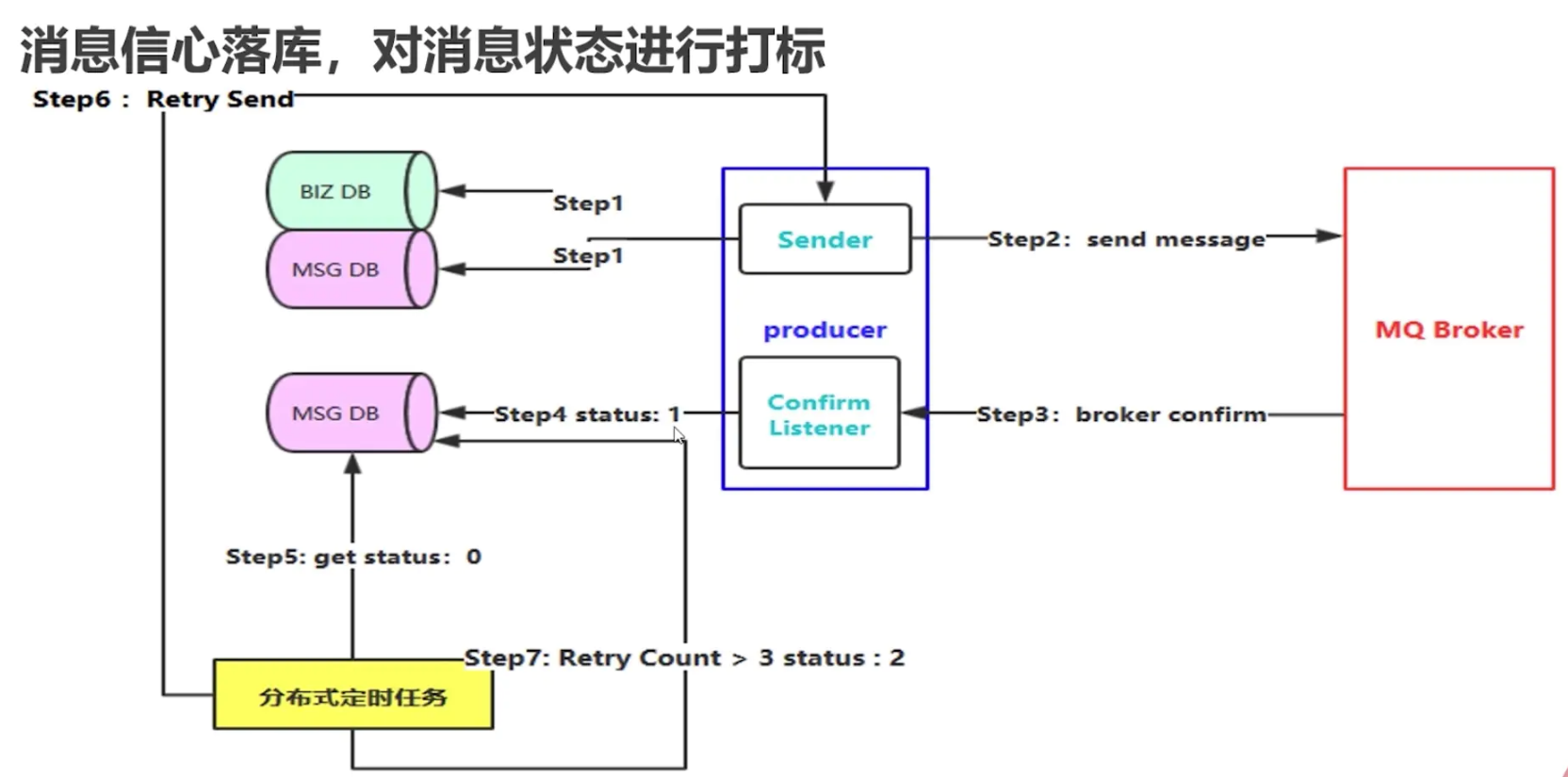 7.当重发次数大于3(阈值自定义)时,此时修改消息状态为2,即消息投递失败。对于投递失败的消息启动补偿机制或者人工去处理失败消息。