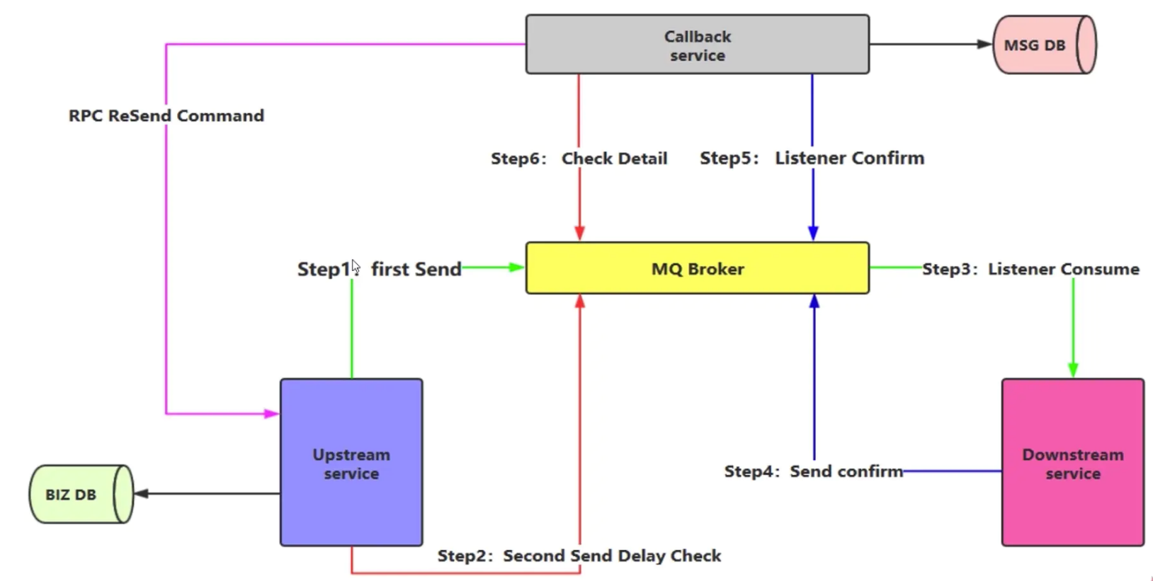 6.同时Callback Service服务监听checkdetailQueue(处理第2步发送check延迟消息),并去MSG DB查询该消息是否被成功消费。如果查询不到check message,则Callback Service服务向Upstream Service服务发送RPC请求,让其重发消息,设置重发次数,达到重发次数后,设置其为消费失败