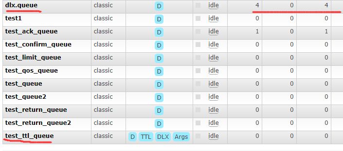 删除TTL创建的 exchange和 queue,然后运行 。上图说明,我这里模拟消息被拒绝(basic.reject/basic.nack)并且requeue=false或者true时分别运行了一下,共四次,四条消息都可以进去死信队列。