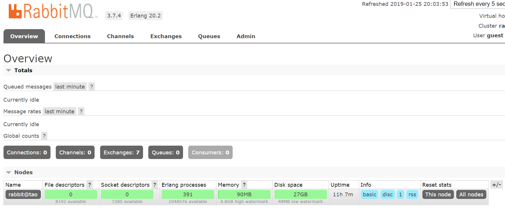 http://127.0.0.1:15672 用户名和密码都为guest 最上侧的导航以此是:概览、连接、信道、交换器、队列、用户管理