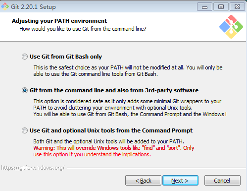 PATH环境选择界面;在 adjusting your PATH environment (调整PATH环境)界面,我们选择第二个 从windows命令行和其它第三方软件: