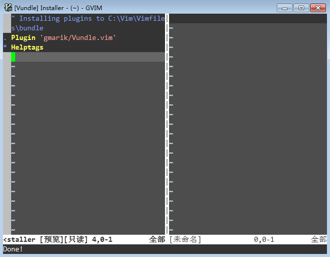 例如安装插件 打开一个gvim, 运行:BundleInstall 或者在命令行运行 vim +BundleInstall +qall 安装完成后插件就能用了