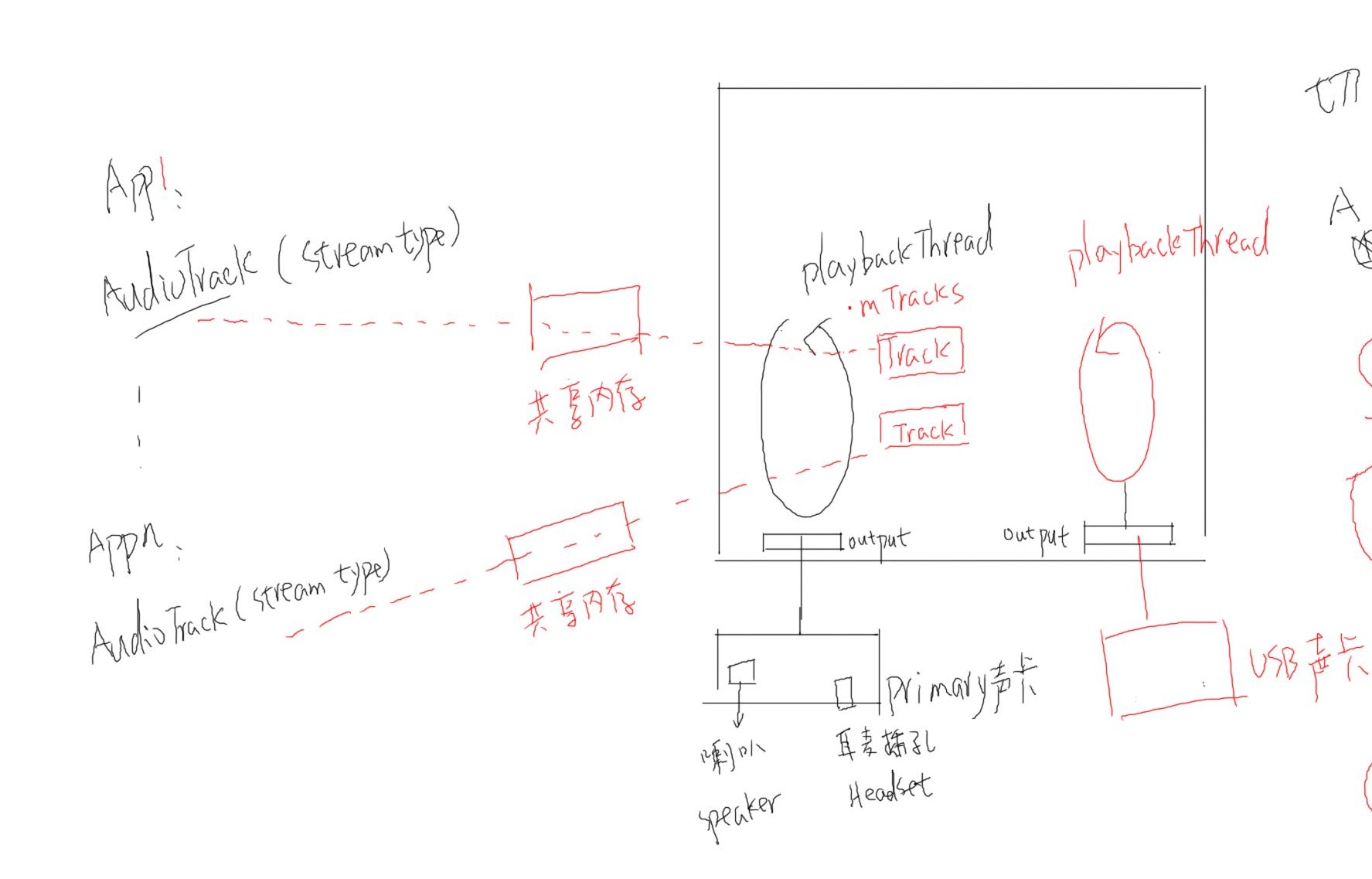 每个声卡的ouput都对应一个playBackThread,其中primary声卡有喇叭(speaker),耳麦插孔(headset)。 假设在系统启动的时候,并没有接入USB声卡,那么应用程序,他想播放声音的时候,会创建一个AudioTrack(其会传入声音的类型),然后会找到对应的播放线程,在线程的内部创建一个Track(属于mTracks数组),AudioTrack与Track之间建立共享内存,APP通过AudioTrack传入声音,然后在经过共享内存传递到对应playBackThread的Track中。 假设同样的原理,有多个APP,图示关系如下: 可以看到每个应用程序APP都在playBackThread中有一个与其对应的Track。显然,每个AudioTrack不停的把数据写入自己对应的Track之中,playBackThread把这些数据去出来之后,然后混合在一起发送给硬件,这些内容都在之前的小节讲解过,不在进行深入解答。