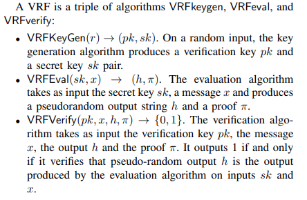 VRF的算法主要包含VRFkeygen, VRFeval,VRFverify: