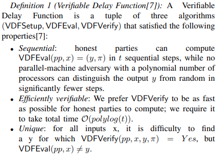 VDF中包含3个基本算法VDFSetup, VDFEval, VDFVerify: