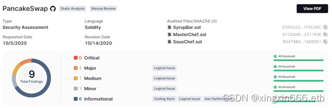 在智能合约审计方面,CertiK 是行业领导者。成百上千个项目已经通过他们对智能合约进行了审计。BSC 最大的自动化做市商 (AMM) PancakeSwap 就是其中一个例子。下面是 Certik 为 PancakeSwap 所做审计的截图。