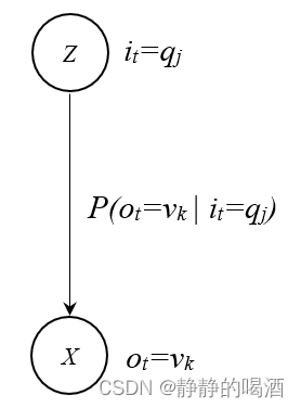 - B \mathcal B B称作发射矩阵。具体表示如下: B = [ b j ( k ) ] K × M \mathcal B = [b_j(k)]_{\mathcal K\times \mathcal M} B=[bj(k)]K×M 其中 b j ( k ) b_j(k) bj(k)表示 t t t时刻下状态变量 i t = q j i_t=q_j it=qj的条件下, t t t时刻下的观测变量 o t = v k o_t=v_k ot=vk的概率。数学符号表示如下: b j ( k ) = P ( o t = v k ∣ i t = q j ) j ∈ { 1 , 2 , ⋯ , K } ; k ∈ { 1 , 2 , ⋯ , M } b_j(k) = P(o_t = v_k \mid i_t = q_j) \quad j \in \{1,2,\cdots,\mathcal K\};k \in \{1,2,\cdots,\mathcal M\} bj(k)=P(ot=vk∣it=qj)j∈{1,2,⋯,K};k∈{1,2,⋯,M}